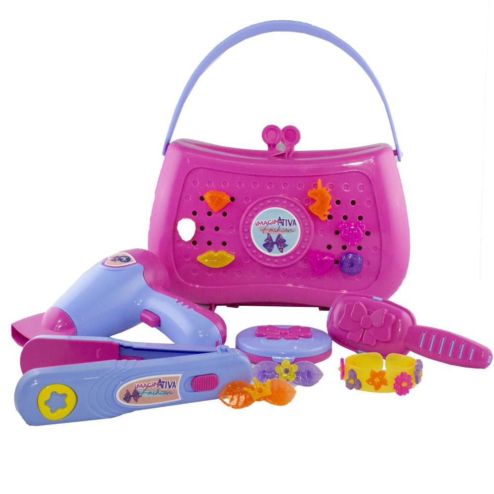 Brincar, passear e ainda personalizar a bolsinha e a pulseira como quiser. Além dos acessórios como secador de cabelo e prancha, vem também presilhas para prender o cabelo. São sete botons exclusivos para encaixar na bolsinha, com formato de diamante, coração, ursinho e boquinha. E para quem não sai de casa sem uma pulseirinha, pode personalizar ela todo dia com os berloques em diversos formatos.