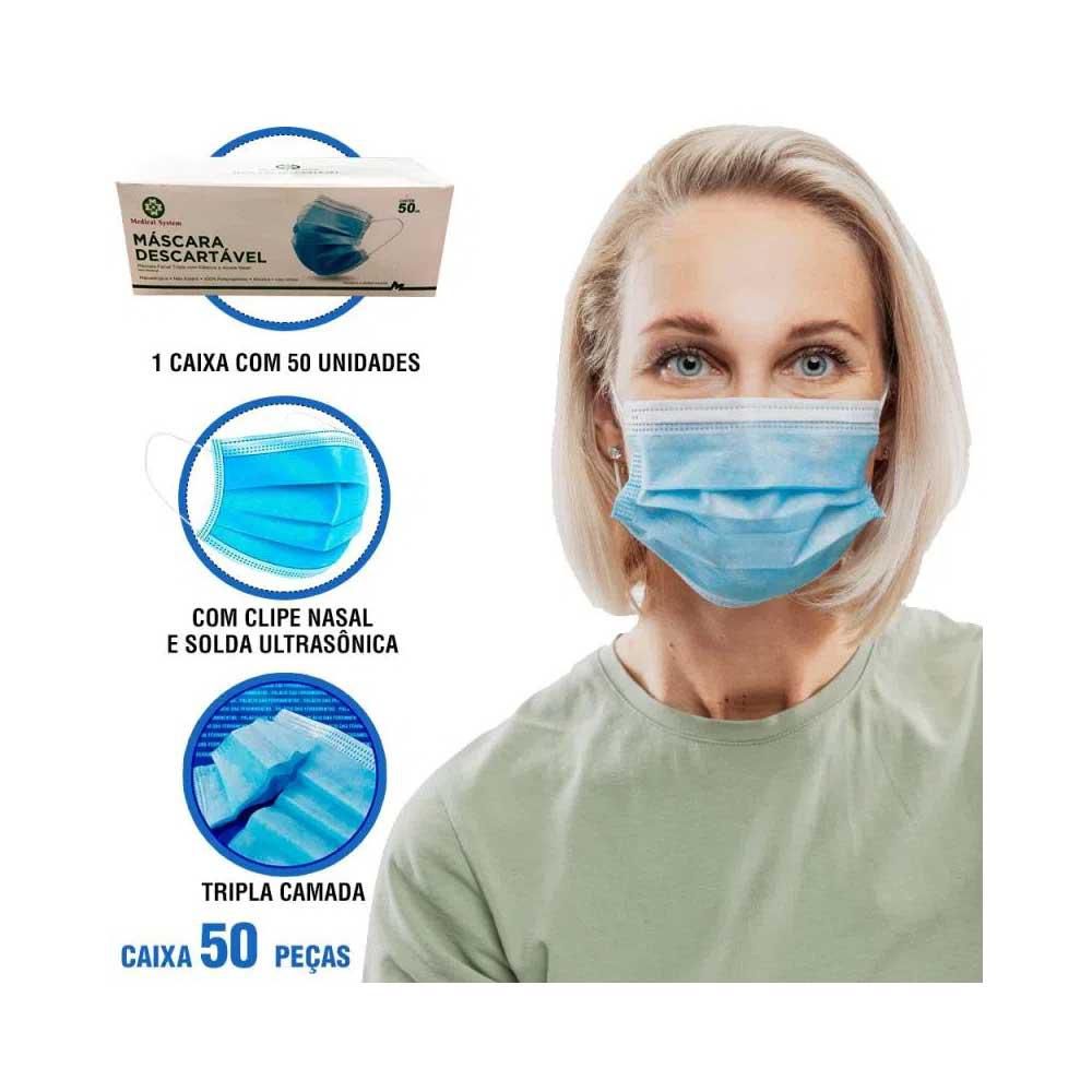 Kit 50 Máscara Descartável Elástico Clipe Nasal Med. System