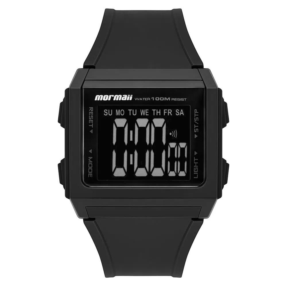 Relógio mormaii da linha acqua. modelo digital na cor preta com pulseira e caixa retangular em polímero 44mm. produto display negativo e a prova dágua 10atm.